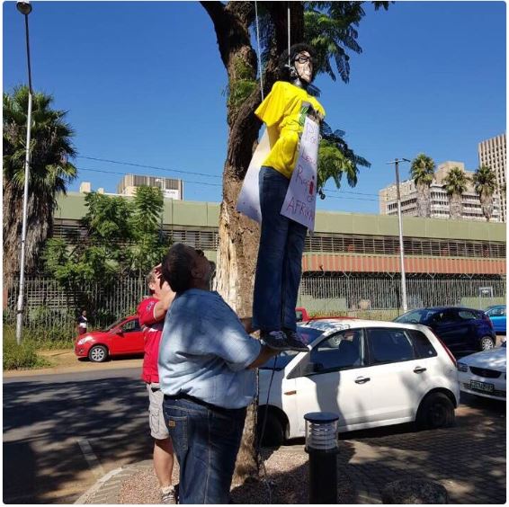 This effigy was paraded in Tshwane on Tuesday and then later hanged on a tree at the Department of Basic Education offices.